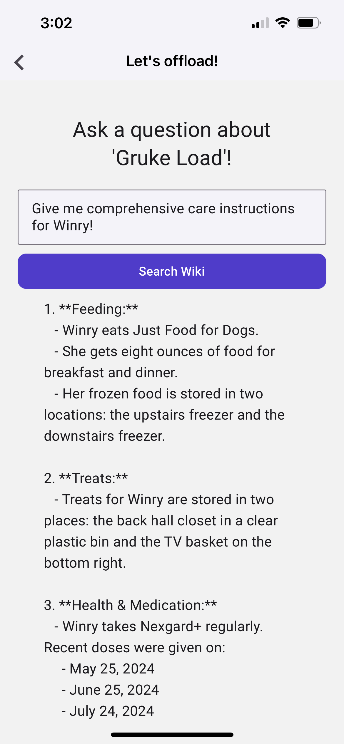 The second level is your AI-powered family wiki (Offload Pro). Offload keeps track of every bit of information you tell it so you (or your load sharers) can ask questions about the when, how, and what of your shared mental load.